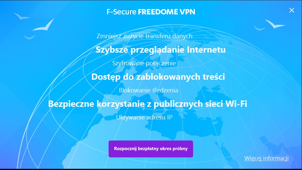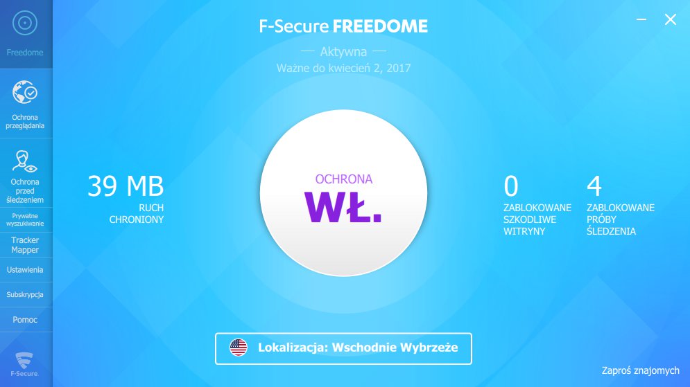 F-Secure Freedome VPN to propozycja przeznaczona dla osób, które cenią sobie prywatność. Program gwarantuje anonimowość w Sieci i chroni urządzenia przed hakerami. Oprócz tego użytkownicy mają możliwość ominięcia blokady regionalnej w wielu popularnych serwisach korzystając z zagranicznych adresów IP. Wszystko to nie ruszając się sprzed komputera.
