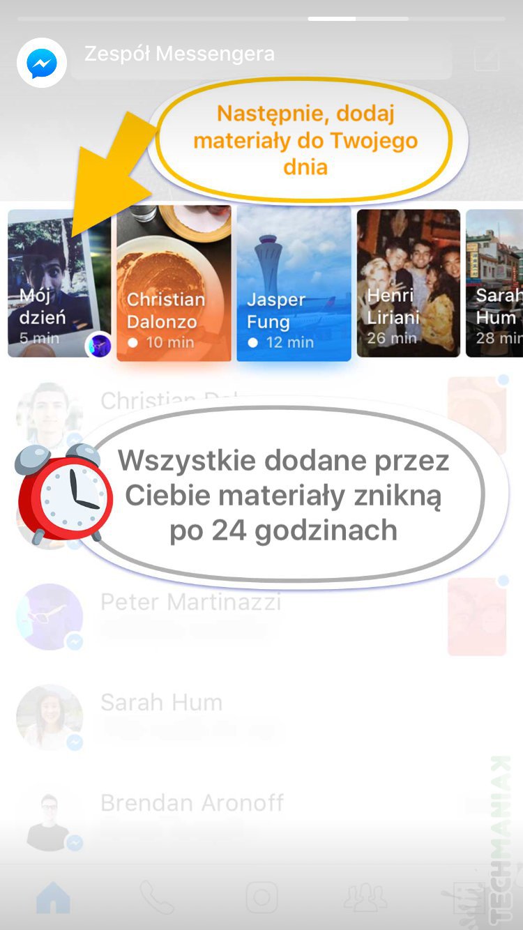 Nowa funkcja nazwana została, jako „Mój Dzień”. Pozwala na tworzenie lub dodawanie zdjęć i filmików z biblioteki smartfona do swojego profilu. Tak, jak w Snapchacie – treści będą znikały po upływie 24 godzin. Do ulepszenia zdjęć można wykorzystać przygotowane naklejki, dorysować elementy czy dodać wybrany tekst. Opublikowane treści będą dostępne dla wszystkich znajomych w górnej belce – nad wszystkimi naszymi rozmowami. Podobna aranżacja została wykorzystana przy okazji wprowadzenia Instagram Stories. Z kolei sam interfejs funkcji przypomina to, co jeszcze jakiś czas temu mogliśmy ujrzeć jedynie w Snapchacie.