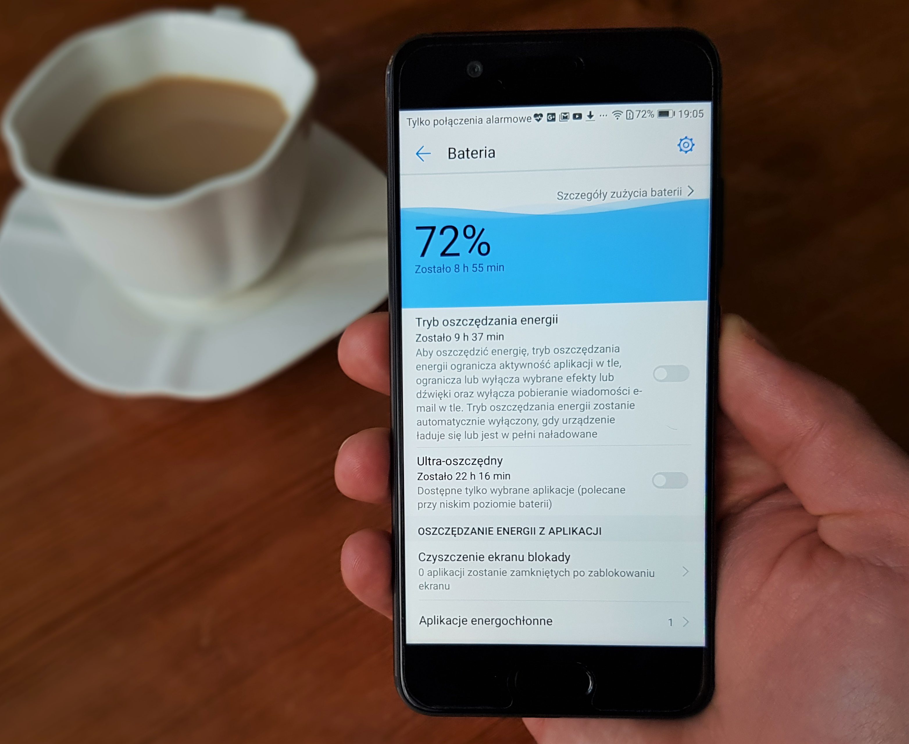 Dołączony Menedżer baterii pozwala dobrać jeden z dostępnych scenariuszy oszczędzenia energii. W najbardziej restrykcyjnym trybie funkcjonalność P10 zostaje ograniczona do podstawowych funkcji, jak możliwość wykonywania połączeń głosowych czy wysyłania wiadomości tekstowych. Jest też opcja oszczędzania energii poprzez uaktywnienie niższej rozdzielczości ekranu – w tym przypadku jest to HD (1280 x 720 pikseli).