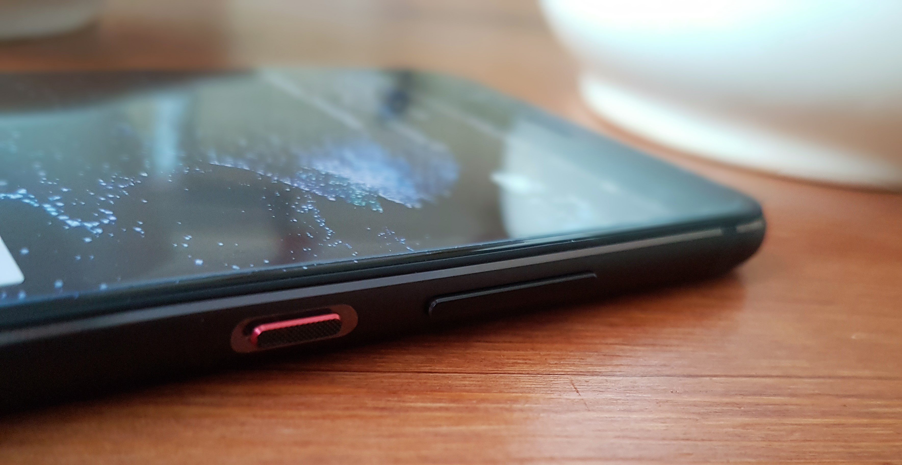 Belka regulacji głośności oraz włącznik znajdują się na prawym boku telefonu. Przycisk zasilania robi świetne wrażenie – to za sprawą chropowatej powierzchni oraz czerwonej farby zaznaczającej kontur. Dolne obrzeże zajęte zostało przez głośnik multimedialny, port USB 2.0 z interfejsem USB typu C, złącze słuchawkowe mini-jack 3.5 mm, a także mikrofon. Na górnej krawędzi ulokowano mikrofon wtórny, po lewej stronie zaś szufladkę na kartę SIM. To standardowe rozmieszczenie elementów – bez zbędnych udziwnień.