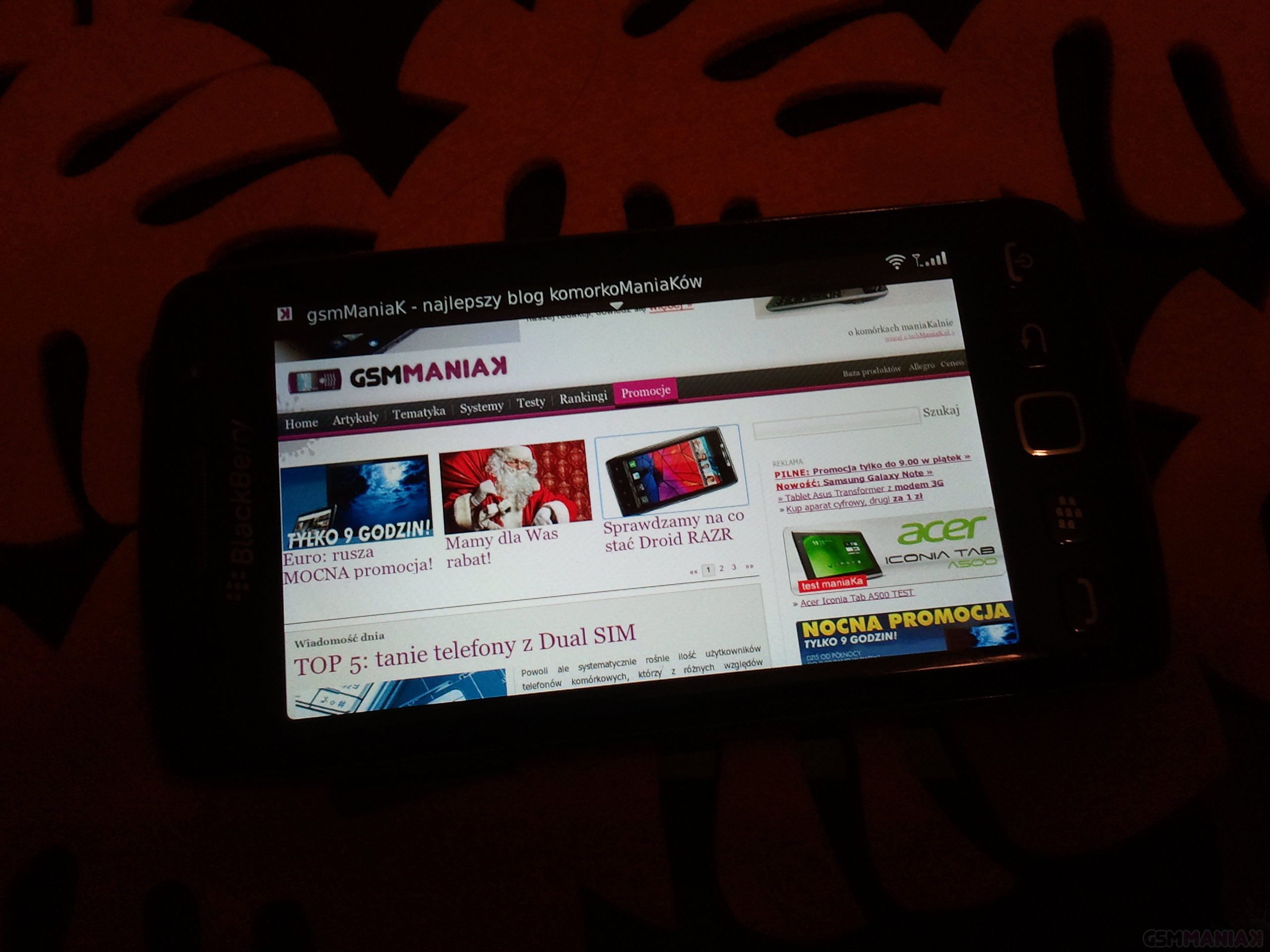 Usługi internetowe, na tle Androida 2.2 jakiego mam zainstalowanego na swoim prywatnym smartfonie, prezentują się ubogo. Strony WWW ładują się poprawnie i w miarę szybko, jednak zdarza się czasem, że reakcja na multidotyk wymaga nieco cierpliwości, zwłaszcza gdy korzystamy z łącza, które nie może pochwalić się wysokimi osiągami. Jeśli jednak znajdziemy sobie mocny sygnał sieci nie ma większych kłopotów ze standardowymi funkcjami, z jakich korzysta wielu z Was codziennie. Trzeba jednak skarcić RIM za niezbyt intuicyjną klawiaturę, która niczym nie wybija się ponad szeroko rozumianą przeciętność.