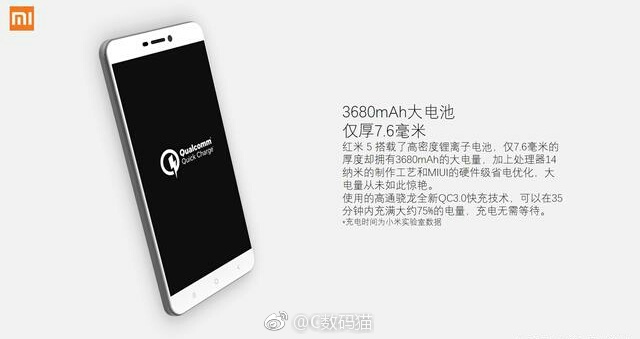 Podobnie jak w przypadku Galaxy Note 8, bateria w Redmi 5 ma zostać zredukowana z 4100 mAh do 3680 mAh. Pomimo zmniejszenia pojemności, Xiaomi w odpowiedzi dodaje technologię Quick Charge 3, dzięki której mniejsze rozmiary baterii nie powinny być tak uciążliwe.