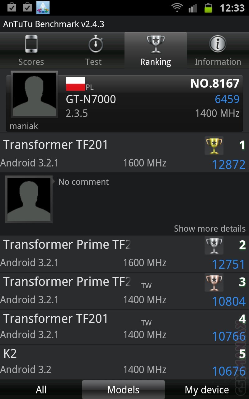 Wyniki jednoznacznie pokazują, że Galaxy Note to nie koniecznie elita jeśli chodzi o szybkość, ale z całą pewnością wyniki jakie osiąga smartfon prezentują się bardzo dobrze, zwłaszcza na tle konkurencji. Jak pokazuje wynik ze Smartbench’a, N7000 zbliżył się dość mocno do demona szybkości, za jakiego cały czas uchodzi Galaxy S2. To czegoś dowodzi.