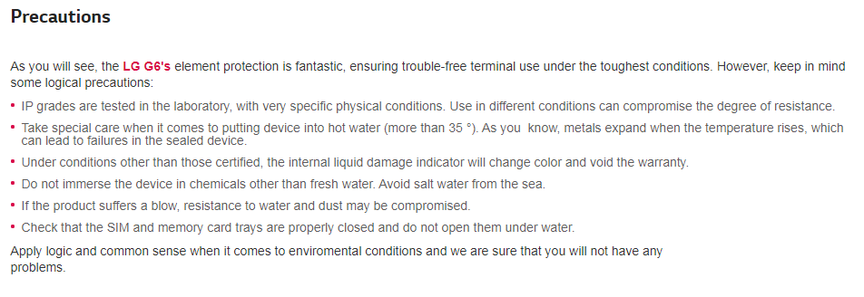 Warto również dodać, że zarówno Samsung jak i LG nie posiada takich obostrzeń w przypadku swoich wodoszczelnych urządzeń (takich jak np. Galaxy Note 8, Galaxy S8, V30, i G6). LG zaskoczyło mnie, ponieważ ich wskazówki są zdecydowanie bardziej zrozumiałe – producent przestrzega np. przed wodą o temperaturze powyżej 35 stopni, z dosyć logicznego powodu – metalowe części ze względu na zwiększoną temperaturę mogą powiększyć swój rozmiar i ulec uszkodzeniu, podobnie jak tory tramwajowe podczas upałów. Jak widać wodoszczelność nie zawsze oznacza dla wszystkich to samo.