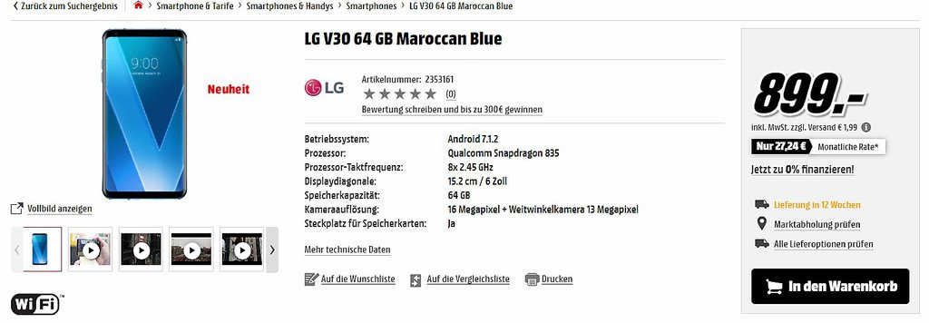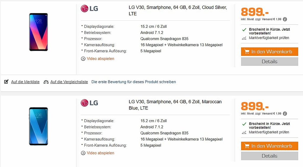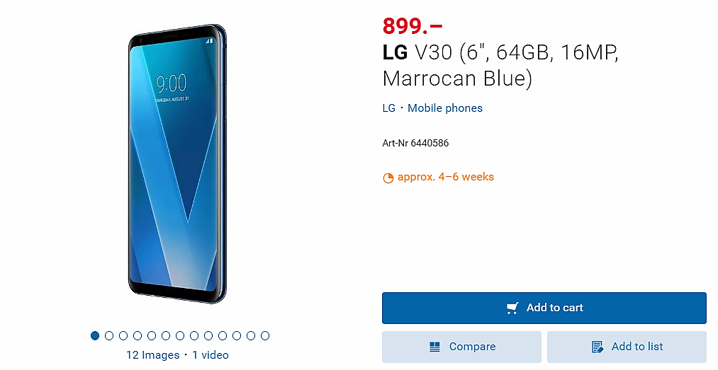 Jeśli chodzi o dostępność LG V30, to Media Markt podaje dość ostrożnie okres aż 12 tygodni, czyli w najgorszym wypadku klienci dostaną zamówiony towar dopiero na początku przyszłego roku. To jednak okres podany asekuracyjnie, bowiem przez jakiś czas LG V30 ma być dostępny w Niemczech tylko w sieci 1&1. Szwajcarzy mówią zaś o okresie 4-6 tygodni, więc o listopadzie, a to pokrywa się z wcześniejszymi informacjami.