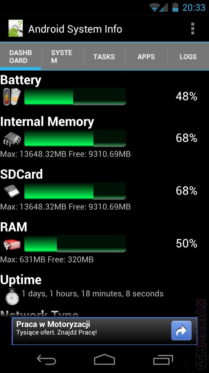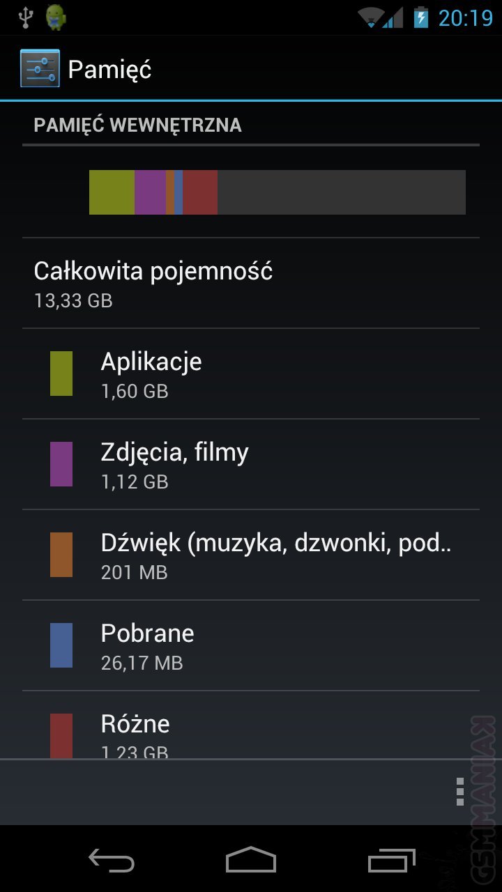 16 GB to dużo, ale w rzeczywistości do naszej dyspozycji jest „tylko 13 GB” – resztę zajmuje system operacyjny. Podobnie sytuacja wygląda z pamięcią RAM. Sprzęt otrzymał 1 GB, ale dla nas zostaje niespełna 400 MB, z czego w naszym egzemplarzu faktyczna wartość to 360 MB – tym możemy rozporządzać do woli. Sądzę, że to dużo, zwłaszcza biorąc pod uwagę, że Nexus posiada mocno pamięciożernego Androida 4.0.