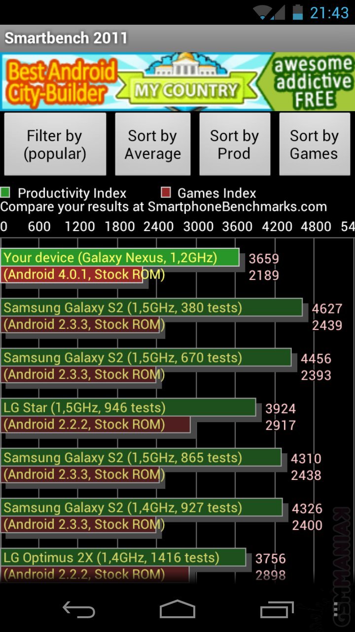 Smartbench 2011 umożliwia uwzględnienie w czasie pomiarów wsparcia ze strony dwurdzeniowego procesora oraz możliwość oceny telefonu pod kątem gier. W tym teście nasz Galaxy Nexus wypadł słabo na tle podrasowanego Galaxy SII (1,5 GHz), lecz standardowa wersja jest właściwie dokładnie taka sama pod względem wydajności. Nexus wyciąga jednak lepsze wyniki niż urządzenia z platformą NVIDIA Tegra 2, co jest niemałym zaskoczeniem.
