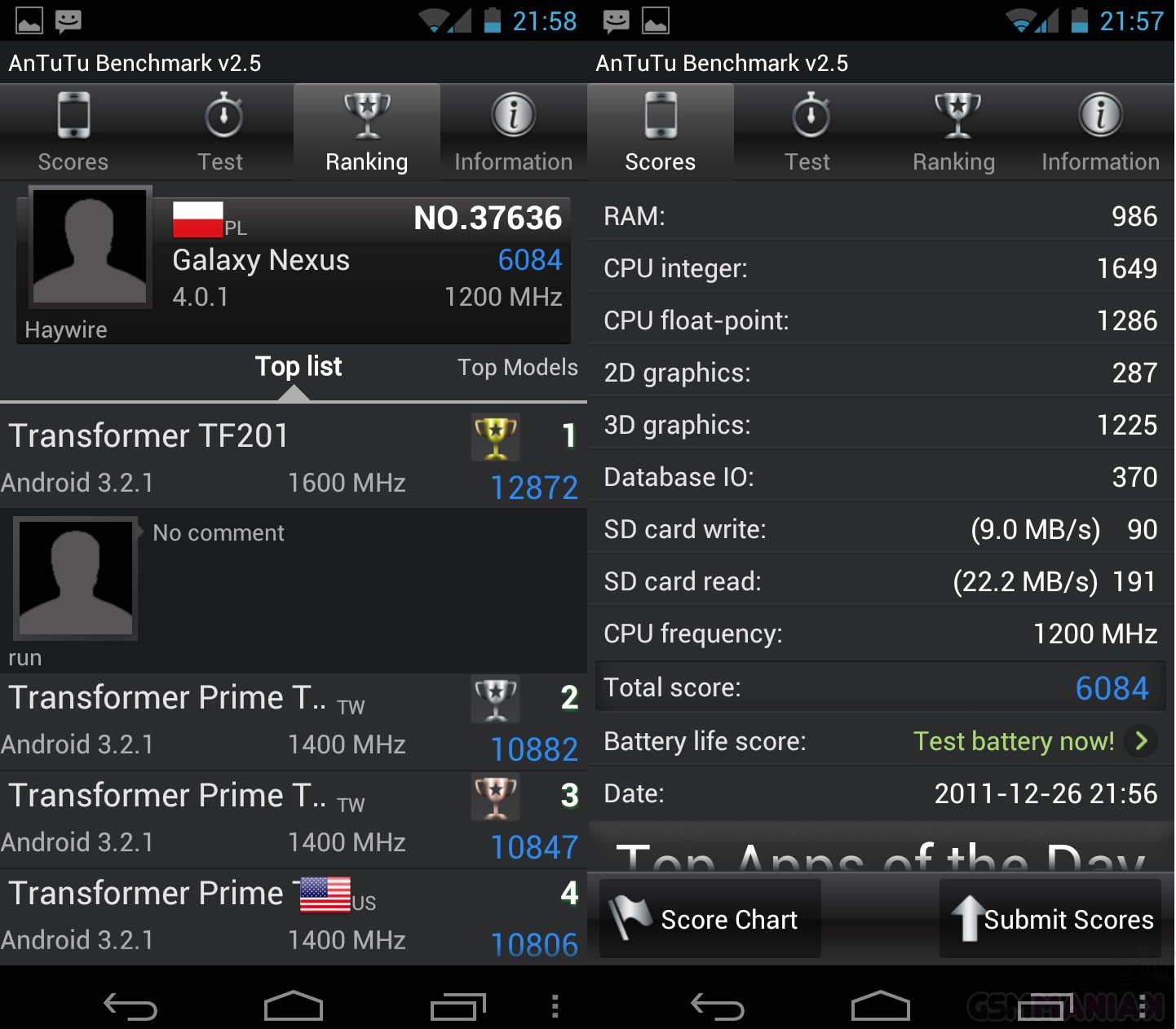 W tym teście ponownie testowany jest układ graficzny PowerVR SGX540 oraz dwurdzeniowy procesor ARM Cortex A9 1,2 GHz od TI. Nasz Galaxy Nexus otrzymał 6084 punktów – więcej niż SGS2, LG Swift X2 oraz tablet Amazon Kindle Fire.
