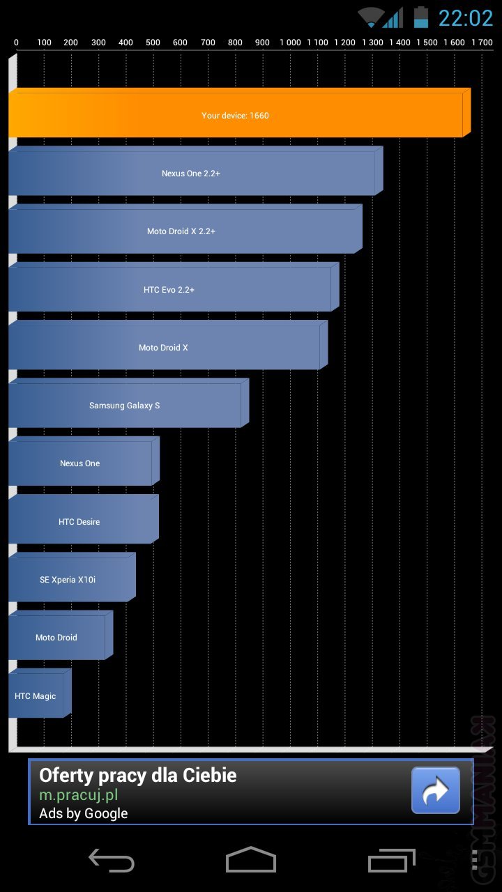 Problemem może okazać się jednak układ graficzny, jaki został wykorzystany w najnowszym Nexusie, ponieważ pozostawia on wiele do życzenia i jest stosunkowo słaby w porównaniu z grafiką, którą wykorzystała firma Apple w swoim ostatnim smartfonie – iPhone 4S. Aby jednak pokazać rzeczywiste możliwości telefonu, postanowiliśmy sprawdzić wydajność naszego urządzenia w kilku, popularnych benchmarkach.