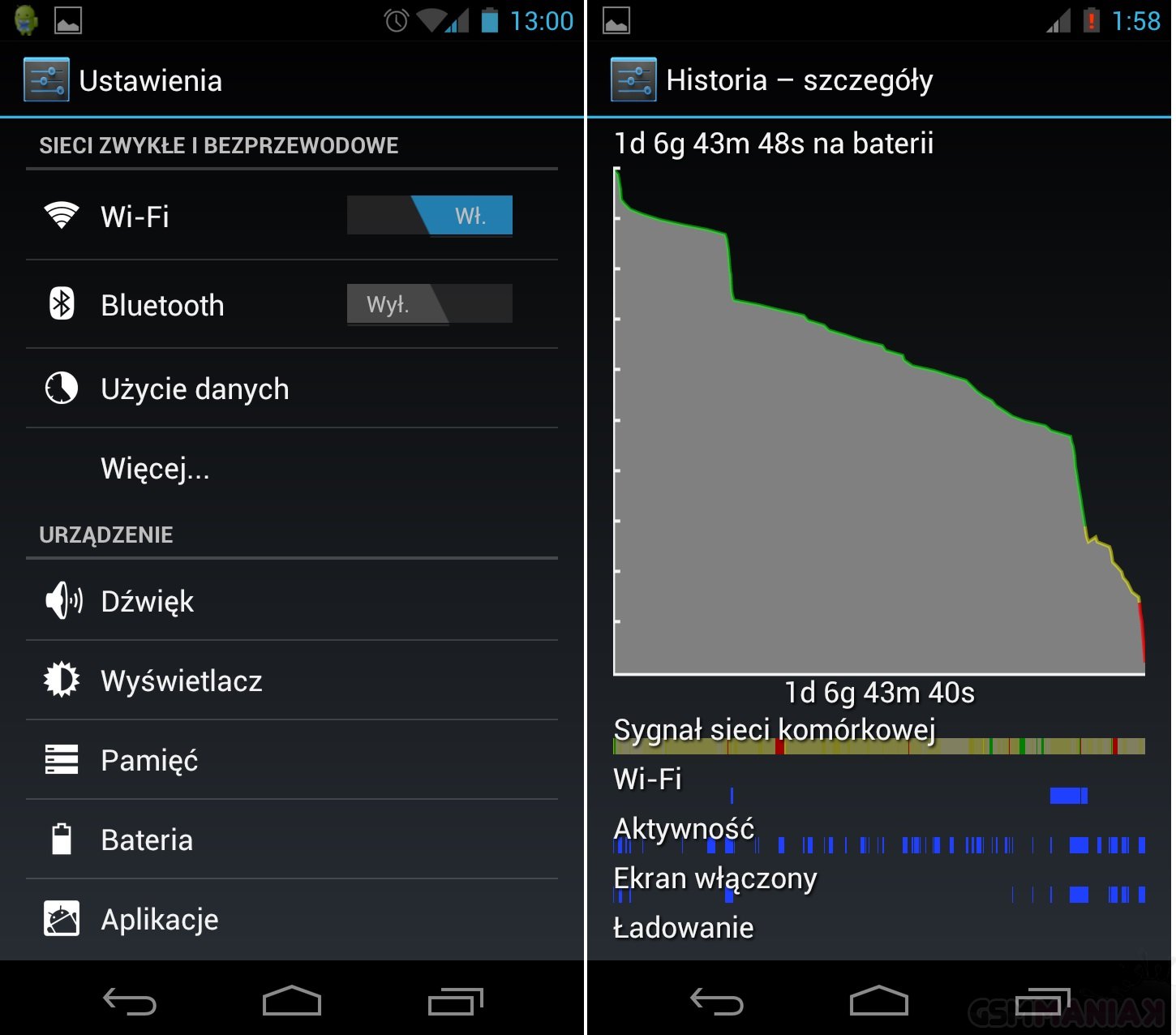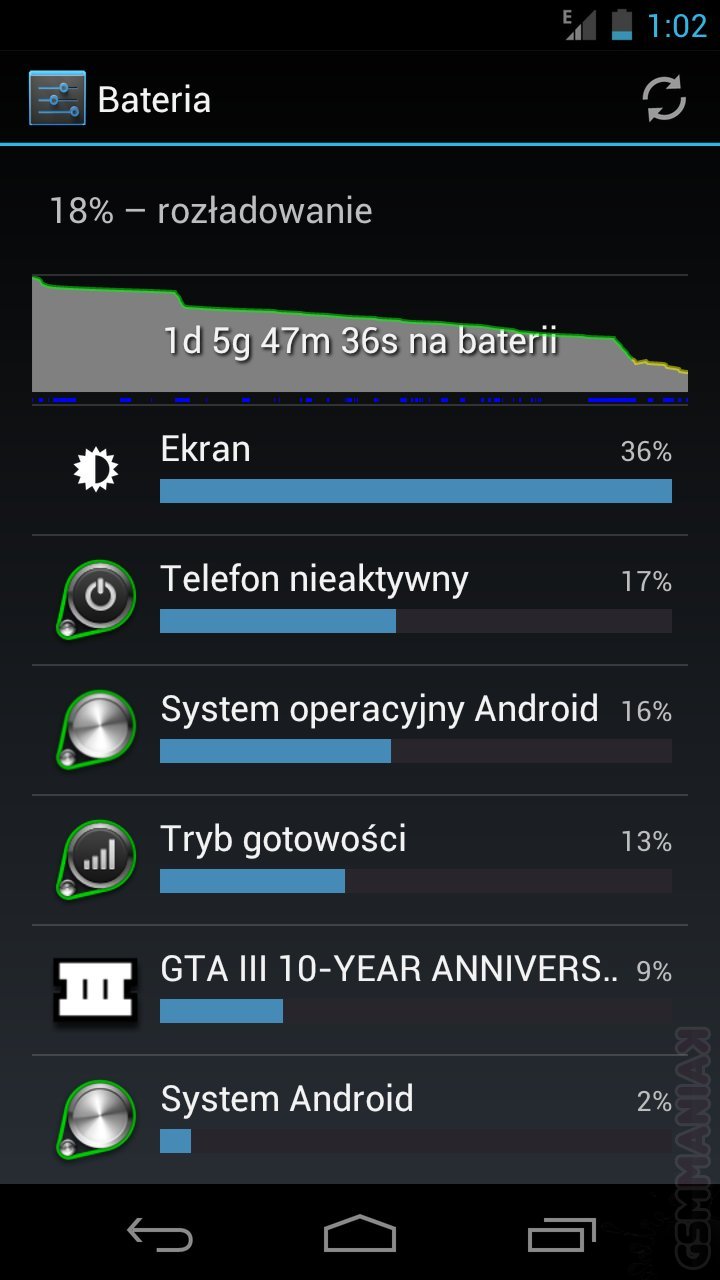 Jednym z elementów, który najbardziej pochłania energię z naszej baterii jest ogromny, 4.65-calowy ekran. Jeśli sprawdzimy w grafiku systemowym, co najmocniej rozładowuje nasz telefon, to zawsze na pierwszym miejscu będzie właśnie ekran, który pochłania dwa razy więcej energii niż kolejny na liście element. W każdym przypadku ustawiona była automatyczna jasność ekranu.