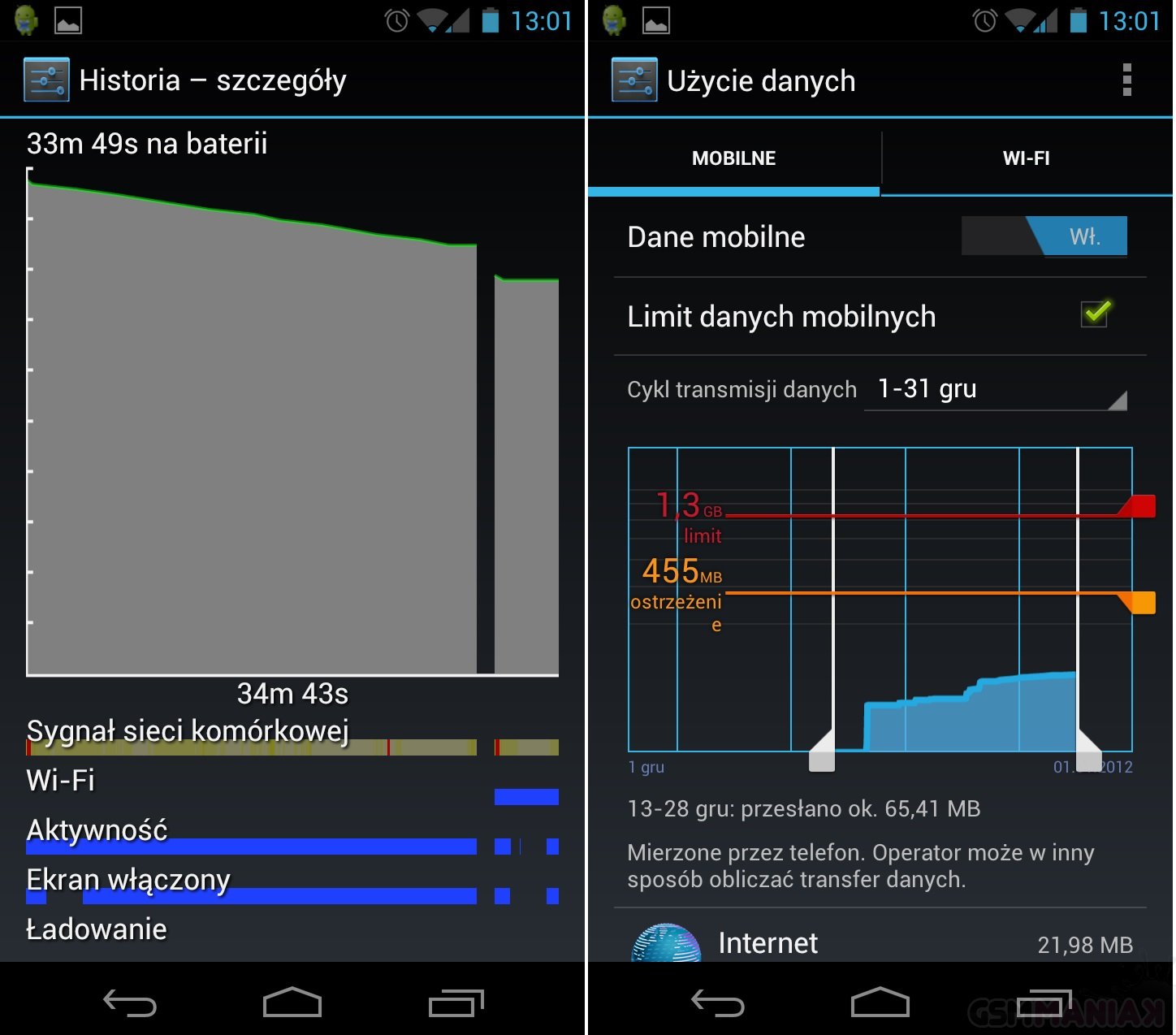 Przy włączonym trybie 3G oraz z włączonym modułem WiFi, nasz smartfon bez trudu wytrzyma w trybie gotowości 48 godzin. Czas ten skróci się do 24 godzin, jeśli zaczniemy wykonywać połączenia, odpowiadać na wiadomości tekstowe oraz korzystać z internetu. Galaxy Nexus przy sensownym wykorzystaniu, wytrzyma nieco ponad 30 godzin. Po tym czasie będziemy podłączyć nasz telefon do ładowarki.