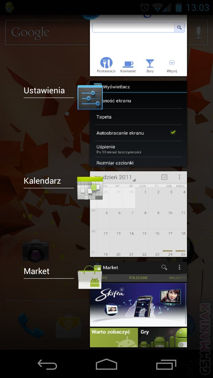 Kolejnym ważnym elementem jest jedna z ikon systemowych, odpowiadająca za wyświetlanie listę ostatnio uruchomionych aplikacji. Gdy wciśniemy trzecią na pasku systemowym ikonę, pojawi nam się długa lista aplikacji, z których korzystaliśmy aż od momentu uruchomienia telefonu. Przyznam szczerze, że nie wiem, jak długa może być ta lista, ale system na pewno zapamiętuje 25 ostatnio uruchomionych aplikacji i wszystkich funkcji telefonu. Ciekawym dodatkiem jest możliwość zamykania ich, poprzez przeciągnięcie danego elementu w stronę prawej krawędzi telefonu.
