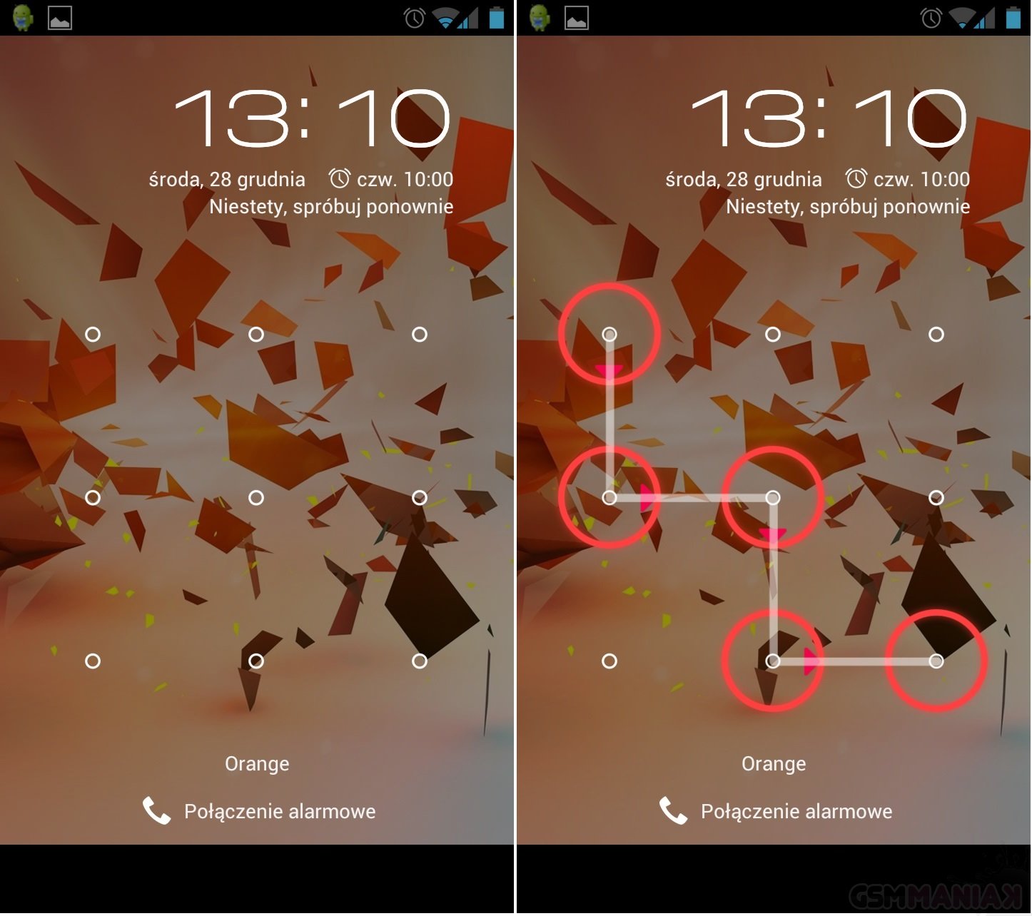Nowością w naszym Samsungu Galaxy Nexus, choć to zasługa systemu operacyjnego, jest nowy sposób odblokowania ekranu. Do wyboru mamy sześć różnych sposobów (włącznie z całkowitą rezygnacją), w jaki możemy przeprowadzić operację: