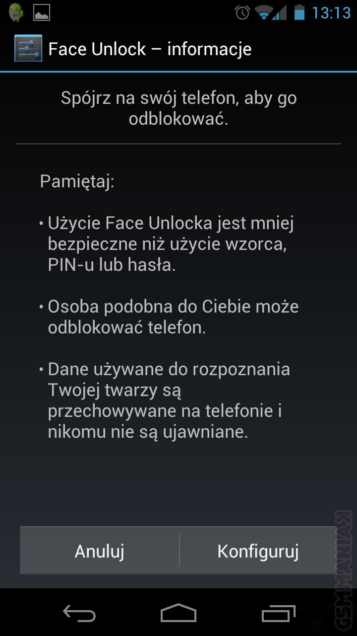 Sądzę, że warto dodać, iż blokada Face Unlock w praktyce sprawdza się dobrze, choć czasami zawodzi. Wystarczy słabe światło lub zbyt mocne, aby telefon nas nie rozpoznał. Sprawdza się również metoda odblokowania telefonu z wykorzystaniem zdjęcia, jednakże aby tego dokonać, należy mieć aktualne zdjęcie w całkiem sporym rozmiarze.