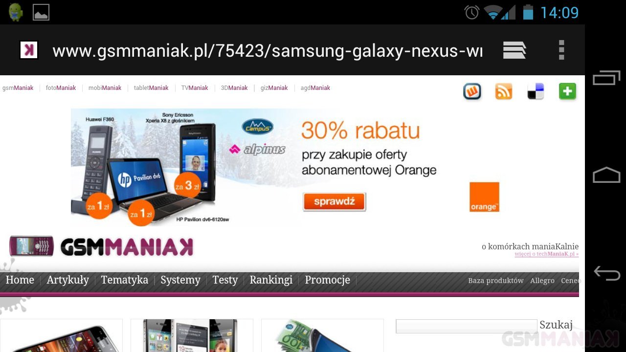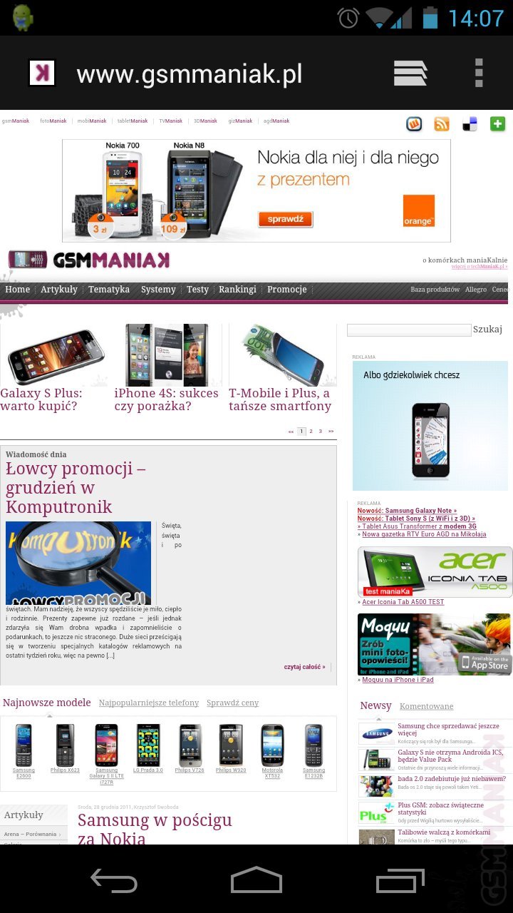 Przeglądarka w Samsungu Nexus umożliwia nam wyświetlanie stron internetowych zarówno w wersji mobilnej, jak również PC. Ta druga pod względem jakościowym jest znacznie lepsza, lecz korzystanie z niej zalecane jest tylko w przypadku, gdy nasz smartfon połączony jest z siecią WiFi. Przez cały czas trwania testów nie miałem żadnych problemów z przeglądarką internetową oraz komfortowym przeglądaniem stron www. Sprzęt świetnie radzi sobie z wyświetleniem stron, które zawierają sporą ilość animacji oraz wtyczek Flash – nawet Hulu.com.