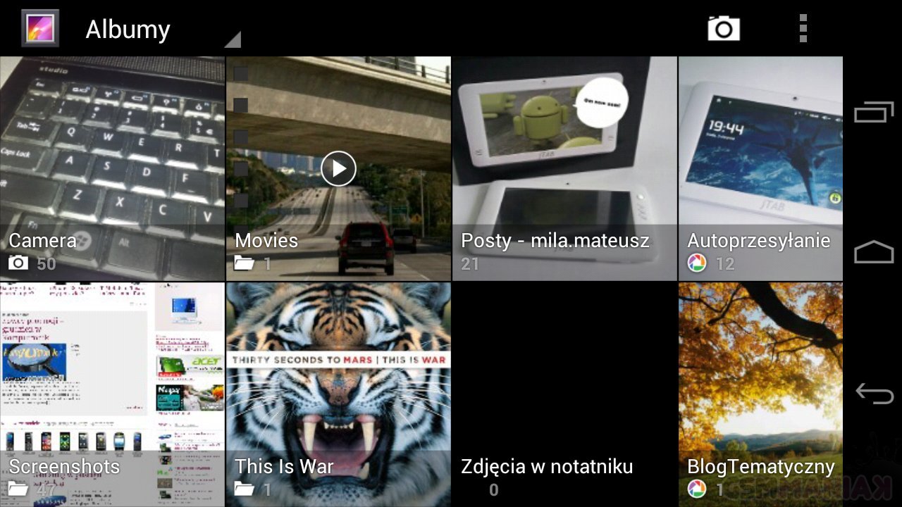 Galeria: Prosta i przejrzysta aplikacja, w której znajdują się wszystkie multimedialne elementy (zdjęcia, filmy, screenshoty), jakie znajdują się w naszym urządzeniu. System automatycznie skanuje nasz telefon w poszukiwaniu nowych zdjęć i filmów, a następnie gromadzi je w specjalnych albumach. Dzięki temu łatwiej jest odnaleźć interesujące nas zdjęcie, a oprócz tego uzyskujemy możliwość natychmiastowego przesłania lub edycji wybranych materiałów. Z pozycji Galerii możemy jednocześnie uruchomić interesujące nas materiały wideo. Odtwarzacz rozpoznaje najpopularniejsze formaty wideo, choć na chwilę obecną wydaje mi się, że filmy nie są odtwarzane z należytą płynnością. Mam jednak nadzieję, że aktualizacja systemowa rozwiąże ten problem.