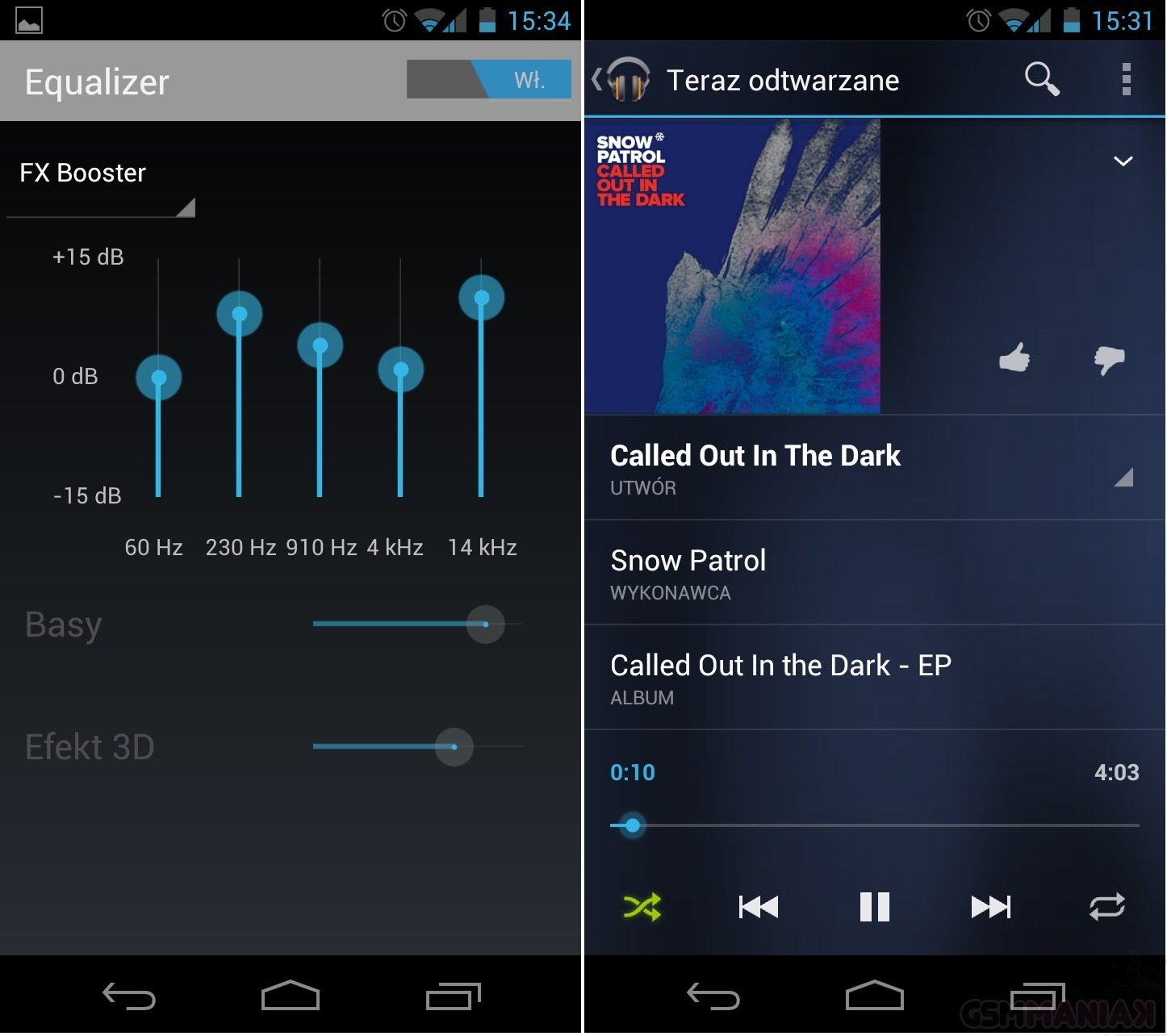 Muzyka: Standardowy odtwarzacz muzyczny pd strony wizualnej prezentuje się interesująco, ale nie należy spodziewać się rewelacji. Jeśli w naszym urządzeniu znajdują się jakieś utwory muzyczne, to smartfon automatycznie doda je do listy „Najnowszych” utworów. Dodatkowo pobrana zostanie grafika z albumu (jeśli jest). Odtwarzacz umożliwia nam również wyszukiwanie utworów, grupowanie ich oraz tworzenie własnych playlist. Do odtwarzacza dodany został prosty w obsłudze Equalizer z systemem FX Booster, dzięki któremu możemy zmieniać efekty dźwiękowe.