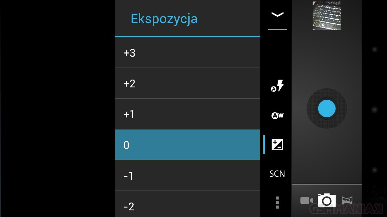 Jeśli chodzi o główny aparat cyfrowy, to posiada on dwa tryby lampy błyskowej, pięć różnych balansów bieli, sześć stopni ekspozycji, pięć trybów scenerii oraz możliwość zapisu lokalizacji. Niemalże te same ustawienie znajdziemy przy przedniej kamerce z tą tylko różnicą, że przednia kamera nie posiada ustawień dla lampy błyskowej.