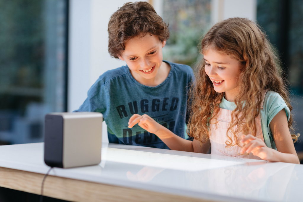 W dużym skrócie: to interaktywny projektor, zmieniający płaską powierzchnię w 23- calowy ekran dotykowy HD, generujący projekcje ultrakrótkoogniskowe zarówno w pionie, jak i w poziomie. Urządzenie rozpoznaje dotyk nawet 10 palców jednocześnie!