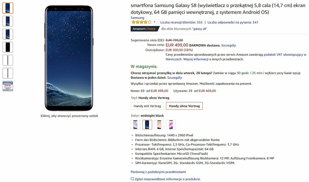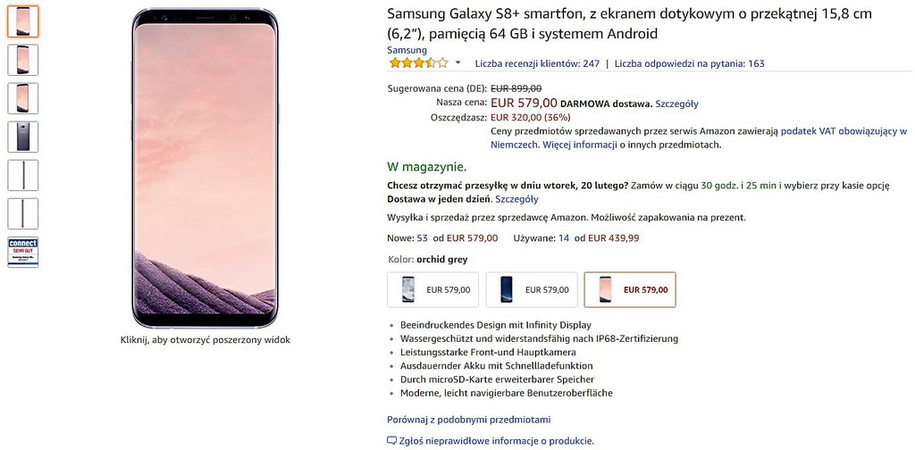 Porównywarka cen informuje, że żaden z polskich, sprawdzonych sklepów nie ma lepszej oferty na Galaxy S8 i Galaxy S8+, więc oferta Amazonu jest naprawdę konkurencyjna. Na dodatek można liczyć na bezpłatną wysyłkę do Polski. Dodam jeszcze, że identyczne ceny znajdziesz w niemieckim Media Markt.
