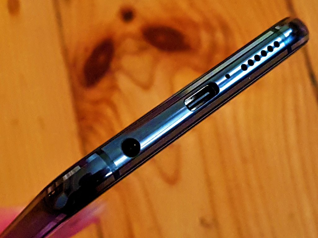 Mamy także dwa złącza: port USB typu C oraz słuchawkowe mini-jack 3.5 mm. Znajdują się one na dolnej krawędzi, tak samo jak głośnik multimedialny, który w przypadku tego modelu jest niskotonowy. Tony średnie przejął głośnik do rozmów. Na lewym boku mamy hybrydowy slot kart SIM, na górne obrzeże trafił natomiast mikrofon wtórny.