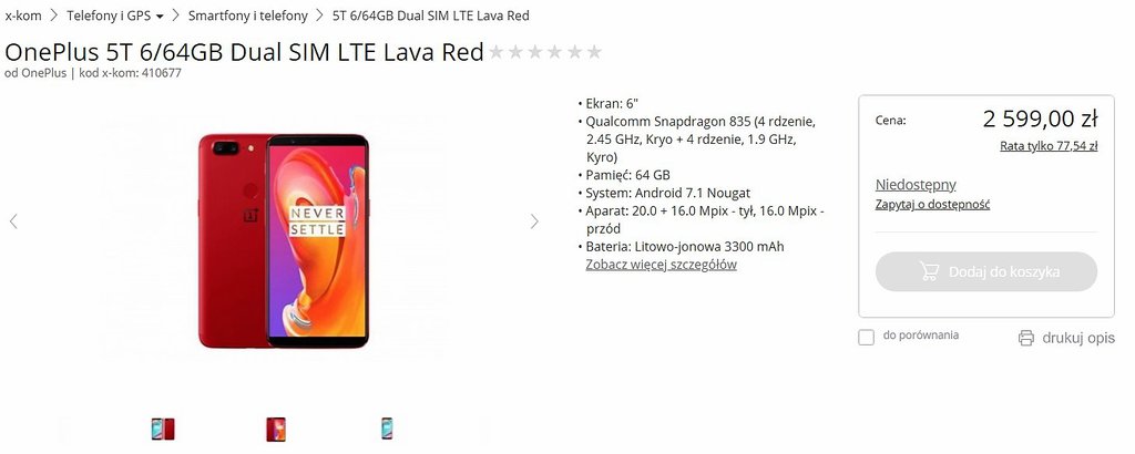 - OnePlus 5T 6GB/64GB Lava Red – 2699 złotych,
