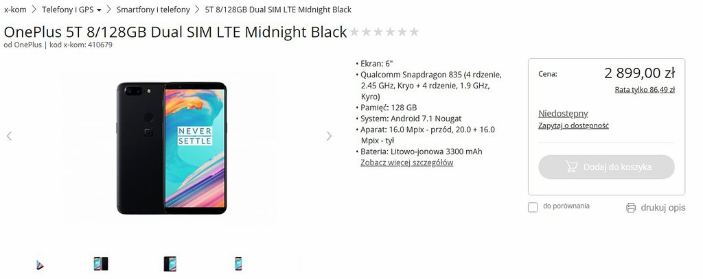 Na stronach internetowych sklepów x-kom i Komputronik odnalazłem smartfon OnePlus 5T. Jak na razie widnieje on jako niedostępny, ale to ewidentna zapowiedź tego, że oba sklepy przymierzają się do rozpoczęcia sprzedaży OnePlus 5T. Przy okazji poznaliśmy też ceny obu wersji pojemnościowych OnePlus 5T, ale niestety nie pokrywają się one ze sobą.