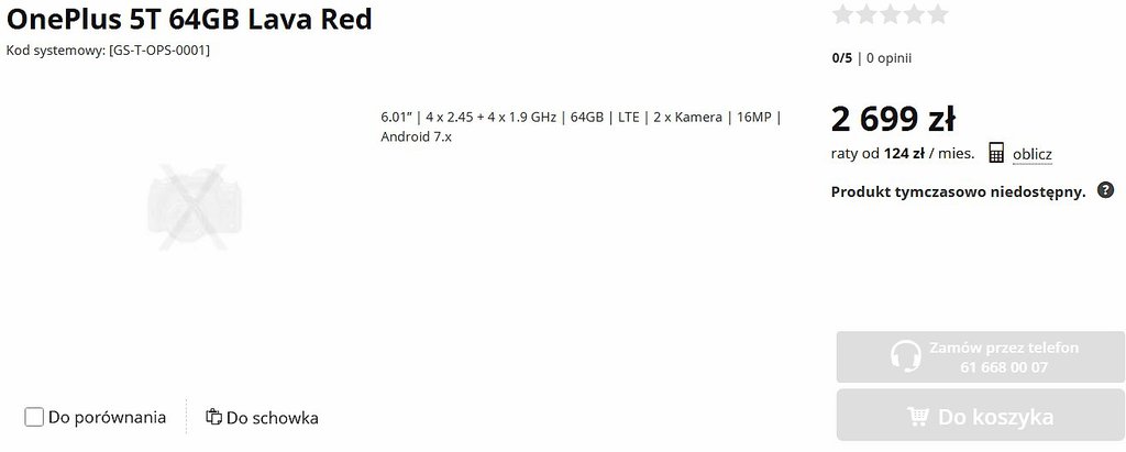 - OnePlus 5T 6GB/64GB (Lava Red, Midnight Black) – 2599 złotych,