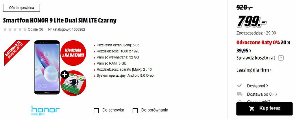 W sklepach Media Markt i Saturn, smartfon Honor 9 Lite w każdej wersji kolorystycznej kosztuje 799 złotych, co jest najniższą ceną na rynku. Powiem więcej – rozejrzałem się po portalach aukcyjnych i z tego co widzę nawet tam trudno znaleźć lepsze oferty. To oznacza, że dwa wymienione przeze mnie sklepy przygotowały naprawdę sensowną promocję.