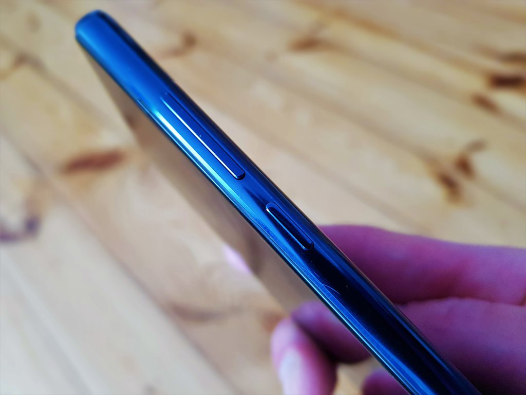 Jeśli chodzi o rozmieszczenie elementów na obrzeżach, to producent nie eksperymentował, choć zdecydował się zrezygnować z umieszczenia złącza mini-jack 3.5mm. Belka regulacji głośności znajduje się na prawym boku, a pod nią dedykowany włącznik. Dolne obrzeże zajęte zostało przez głośnik multimedialny, port USB typu C, a także mikrofon. Na górnej ramce znajduje się drugi mikrofon, a na lewym boku podwójny slot kart SIM (nanoSIM + nanoSIM). Jak już zapewne zauważyliście po opisie, specyfikacja nie obejmuje również czytnika kart microSD.