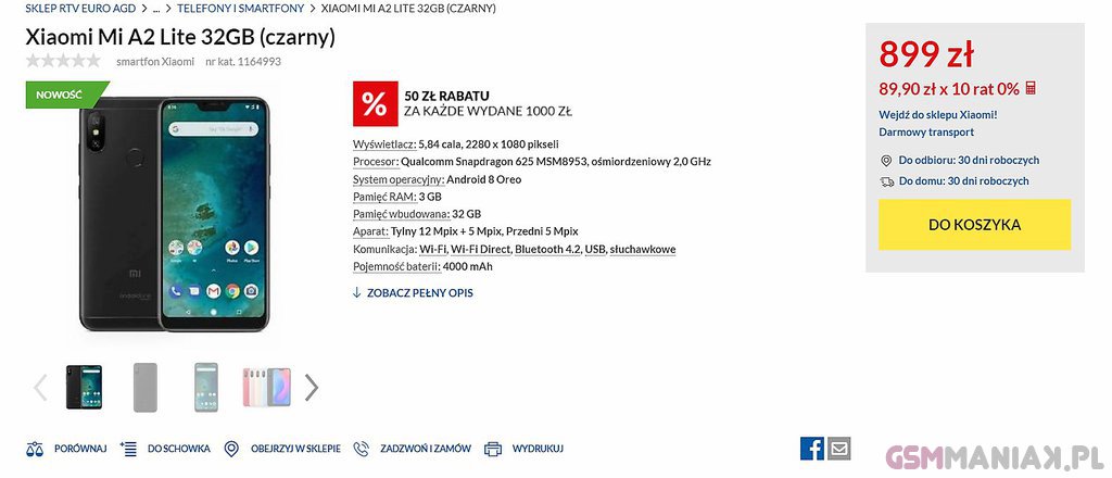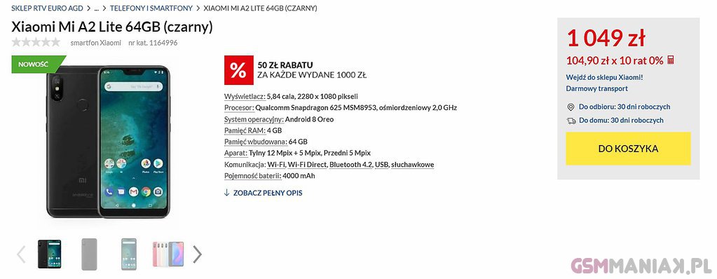 Jeśli chodzi o Xiaomi Mi A2 Lite, to tutaj dostaliśmy jedynie potwierdzenie wcześniejszych informacji. Wersja 3GB/32GB kosztuje więc 899 złotych, a zakup wariantu 4GB/64GB wiąże się z wydatkiem 1049 złotych.