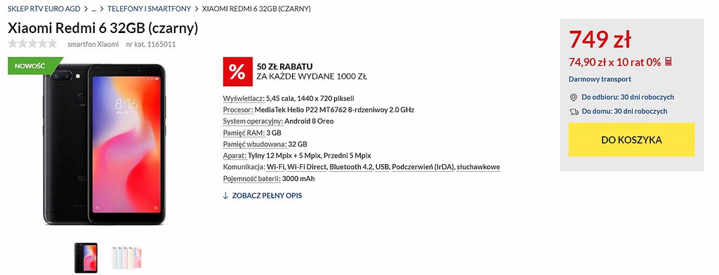 - Xiaomi Redmi 6 3GB/32GB – 749 złotych,