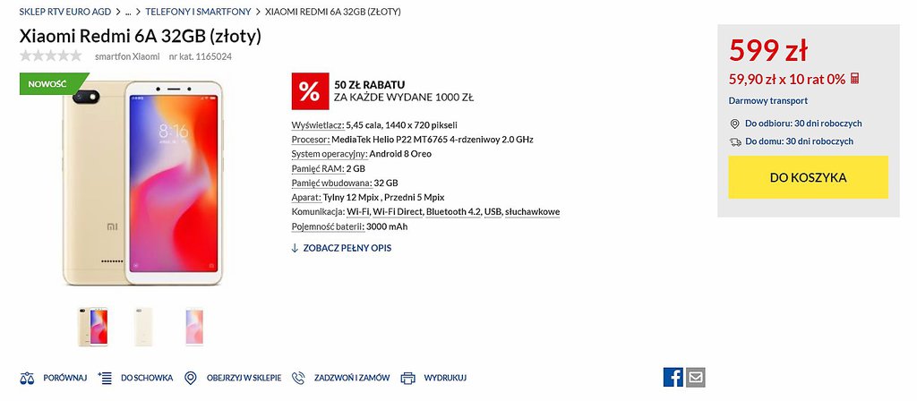 - Xiaomi Redmi 6A 2GB/32GB – 599 złotych,