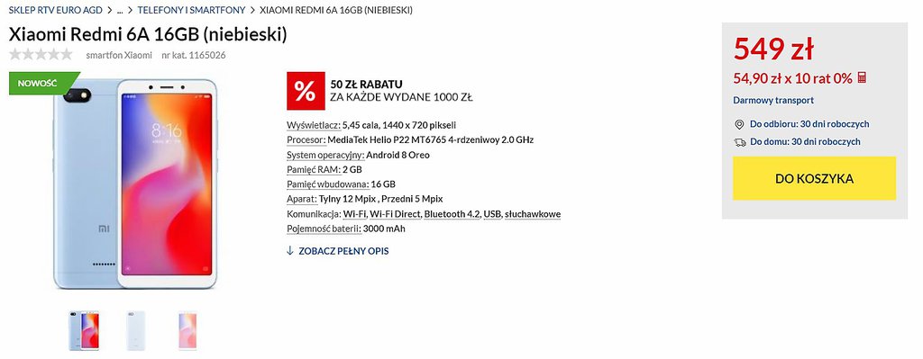- Xiaomi Redmi 6A 2GB/16GB – 549 złotych,