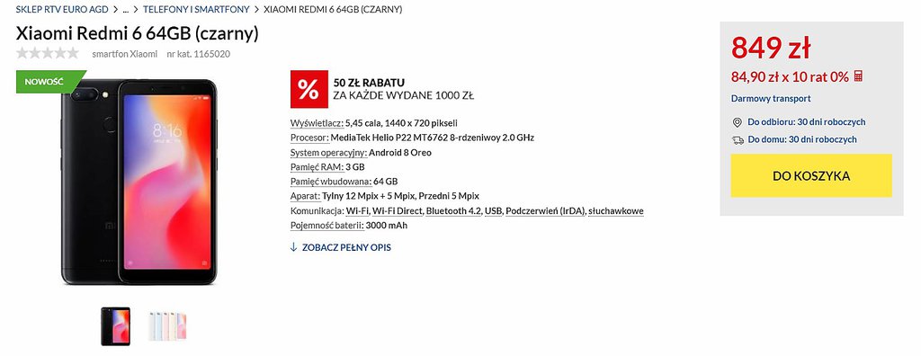 - Xiaomi Redmi 6 3GB/64GB – 849 złotych.