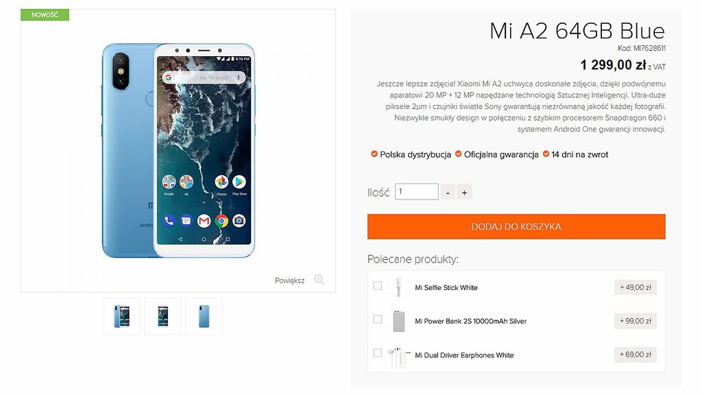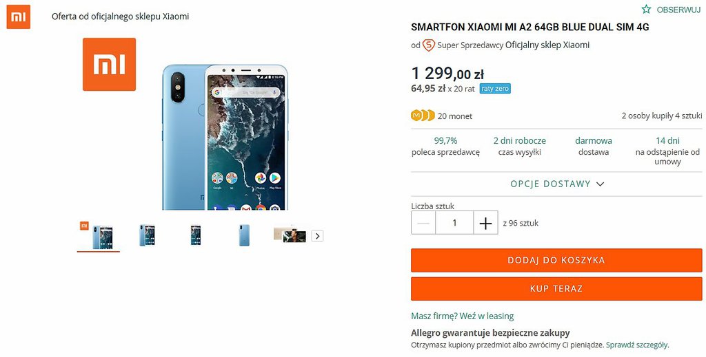 W ramach codziennego poszukiwania promocji i nowości w polskich sklepach, zajrzałem do mi-home, czyli internetowego sklepu autoryzowanych dystrybutorów Xiaomi. Zauważyłem, że można już tam zamówić Xiaomi Mi A2 (64 GB) – tylko w kolorze niebieskim, w cenie 1299 złotych. Podobnie jest w sklepie Xiaomi na Allegro. Jeśli ta wersja kolorystyczna Ci odpowiada, to Xiaomi Mi A2 możesz kupić już dziś, bez konieczności polowania na dostępne sztuki w jutrzejszej promocji x-kom.