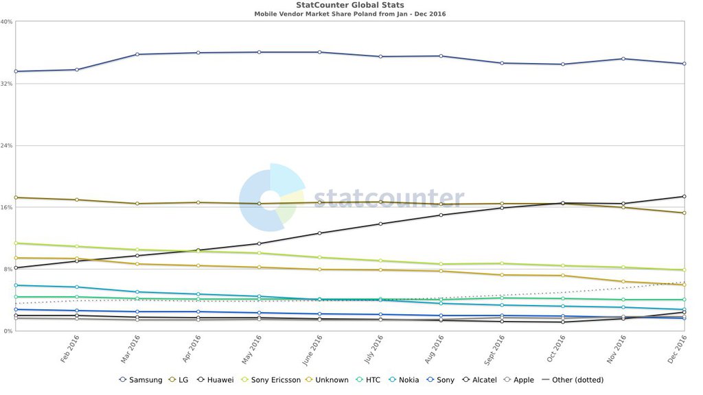 Niech dowodem sukcesu Huawei w Polsce będą statystyki z roku 2016, gdzie chiński producent wzrósł z 8% udziału na 17% i znalazł się na drugiej lokacie – wówczas Samsung spokojnie dominował, posiadając 34% i 17 punktów proc. przewagi nad chińskim rywalem. Wzrost znaczenia Huawei w 2016 widać na poniższym wykresie: