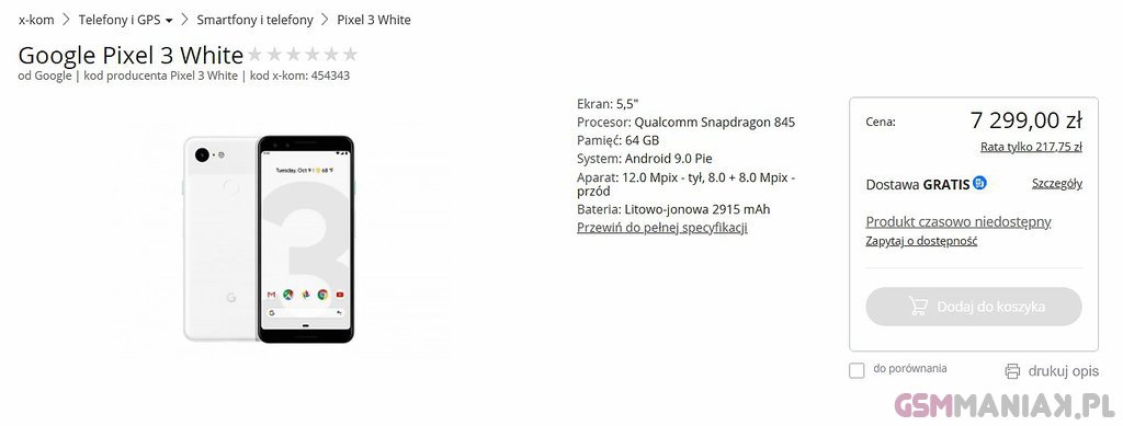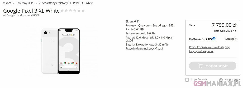 W sklepie x-kom pojawił się Pixel 3 w kolorach czarnym i białym, w wersji 64 GB. Podana cena to… 7299 złotych! To jeszcze nic – czarny i biały Pixel 3 XL (również w wersji 64 GB) jest obecnie wyceniony na 7799 złotych!