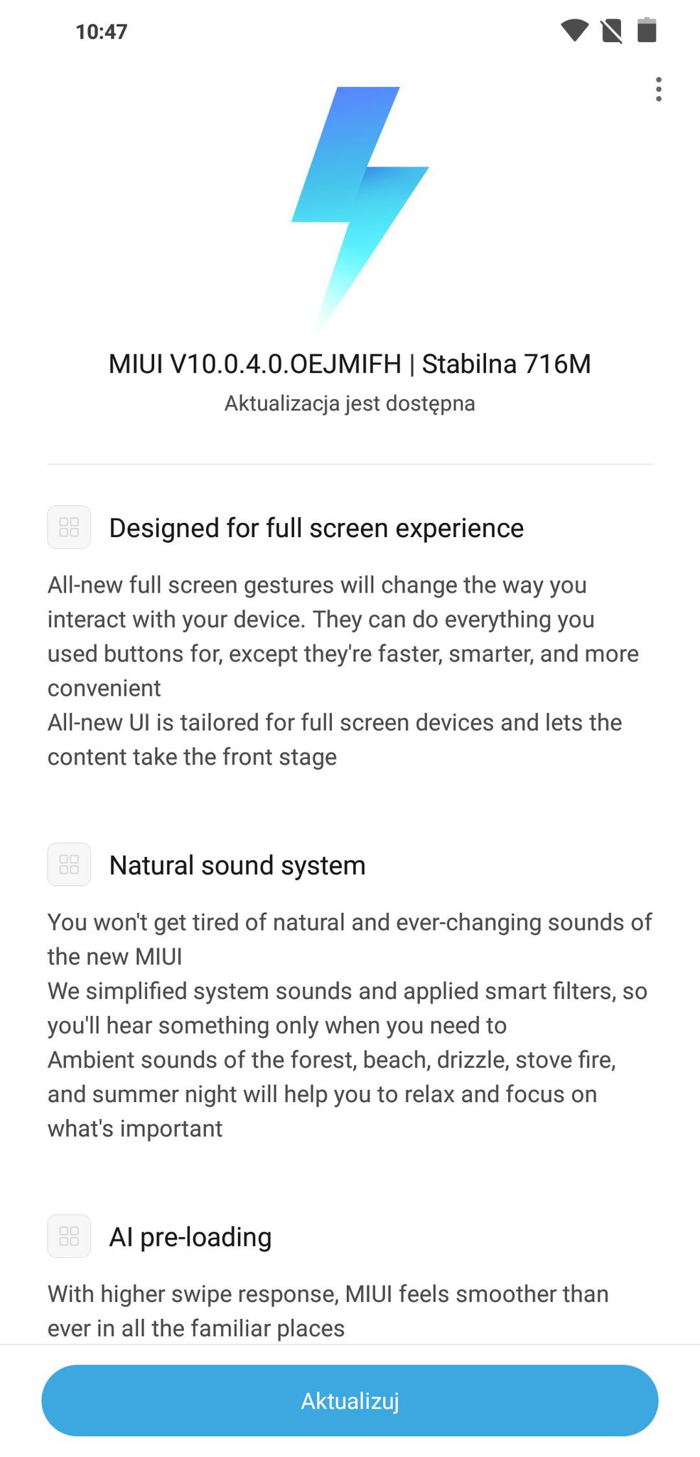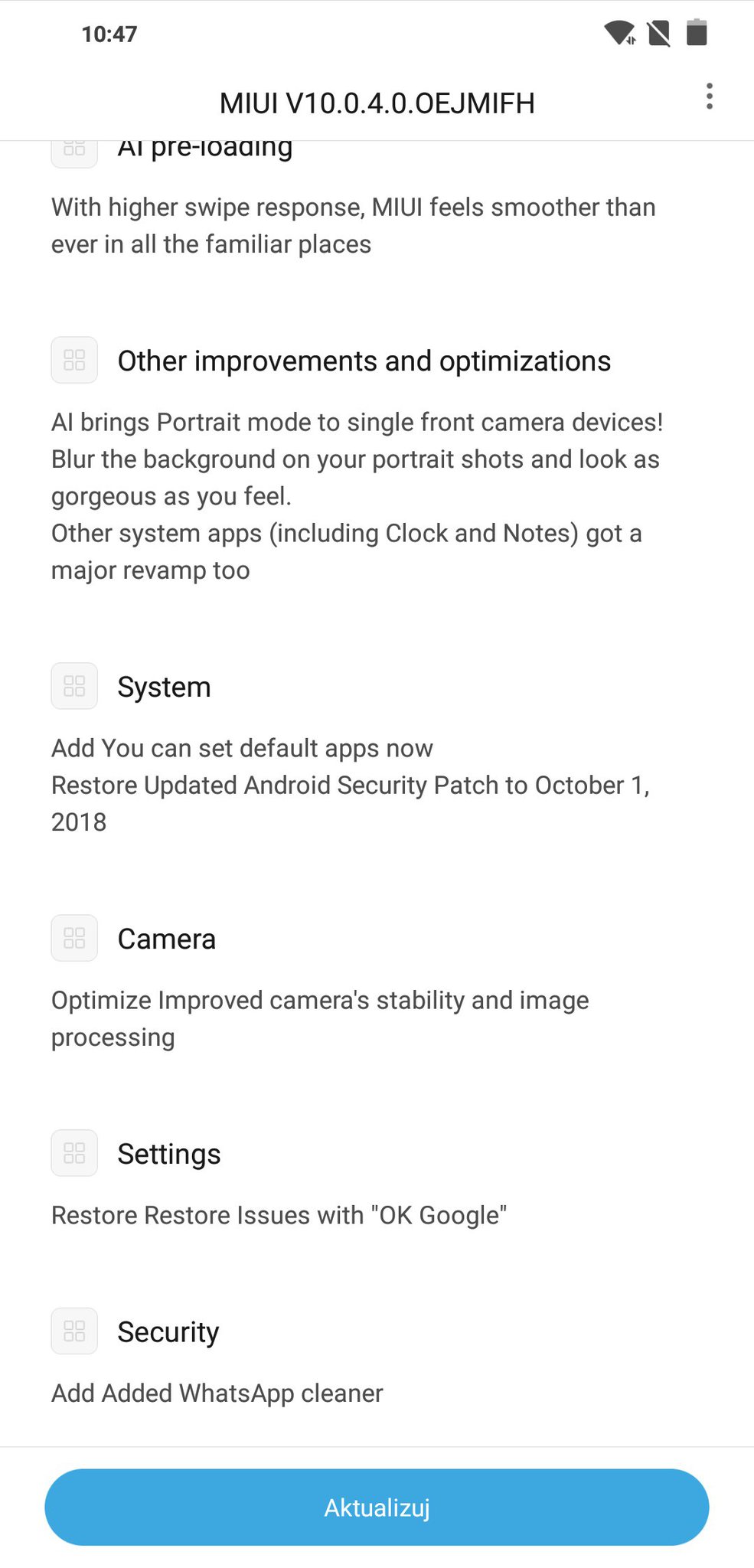 Paczka z aktualizacjami (MIUI V10.0.4.0.OEFJMIFH) waży ponad 700 MB, podczas pobierania warto więc znaleźć się w zasięgu sieci WiFi. Na początek garstka suchych informacji od producenta: