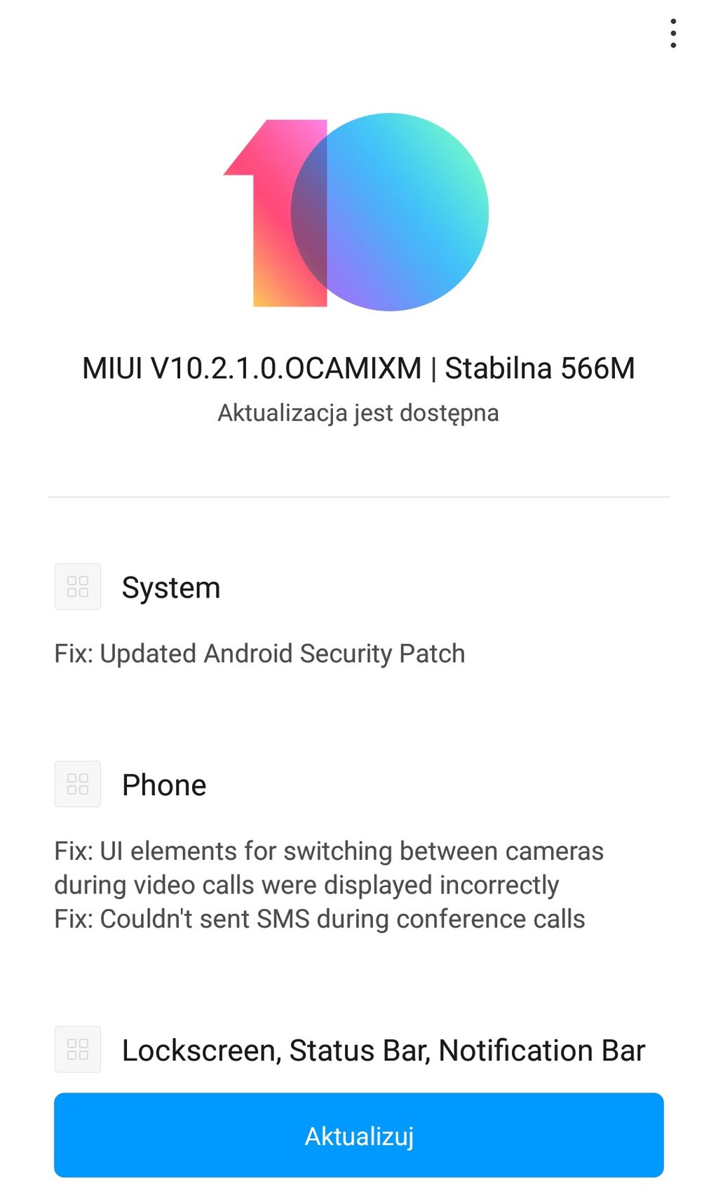 Dziś rano mój Xiaomi Mi 6 wyświetlił komunikat o dostępności nowego oprogramowania, które zostało podpisane ciągiem znaków MIUI V10.2.1.0.OCAMIXM i ważyło 566 MB. To wersja Stabilna, więc aktualizację powinny otrzymać wszystkie osoby, które mają Xiaomi Mi 6 z ROM-em Global i regionem ustawionym na Polskę.