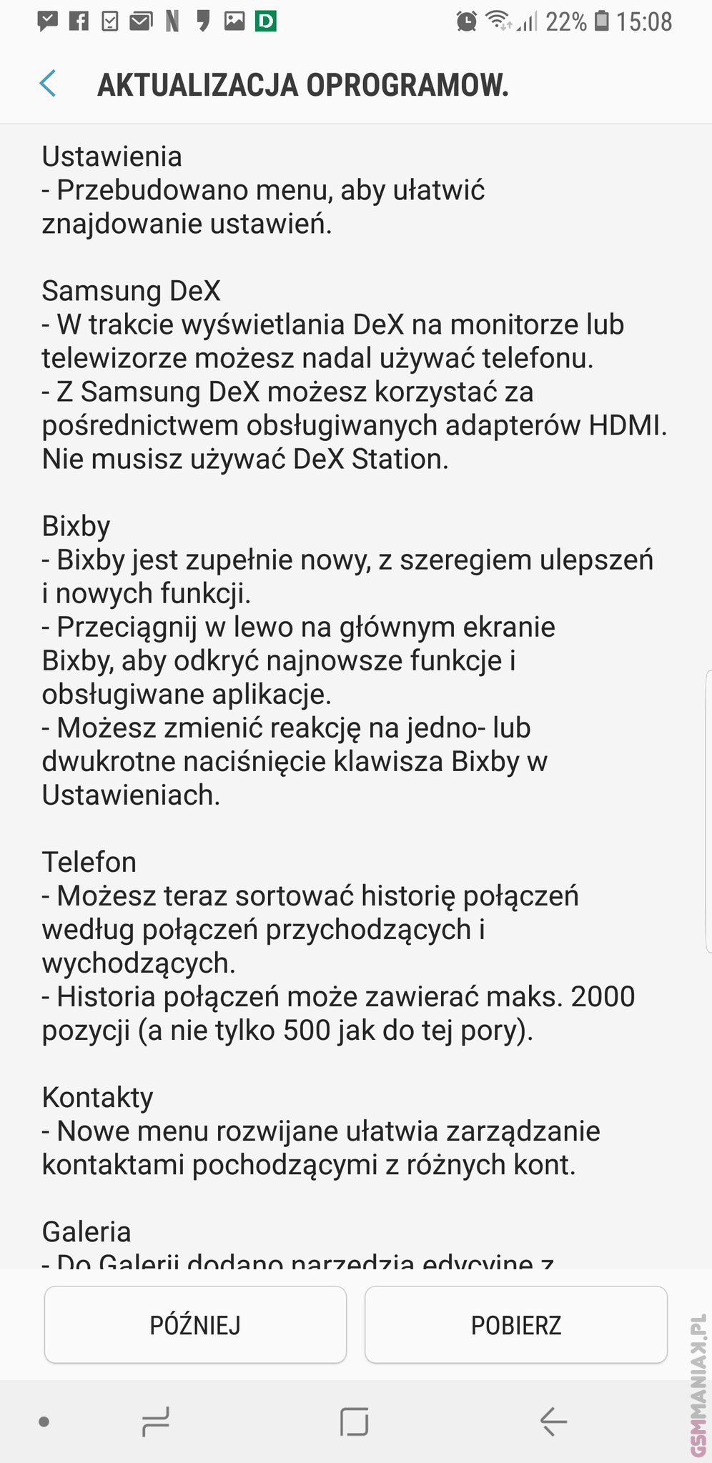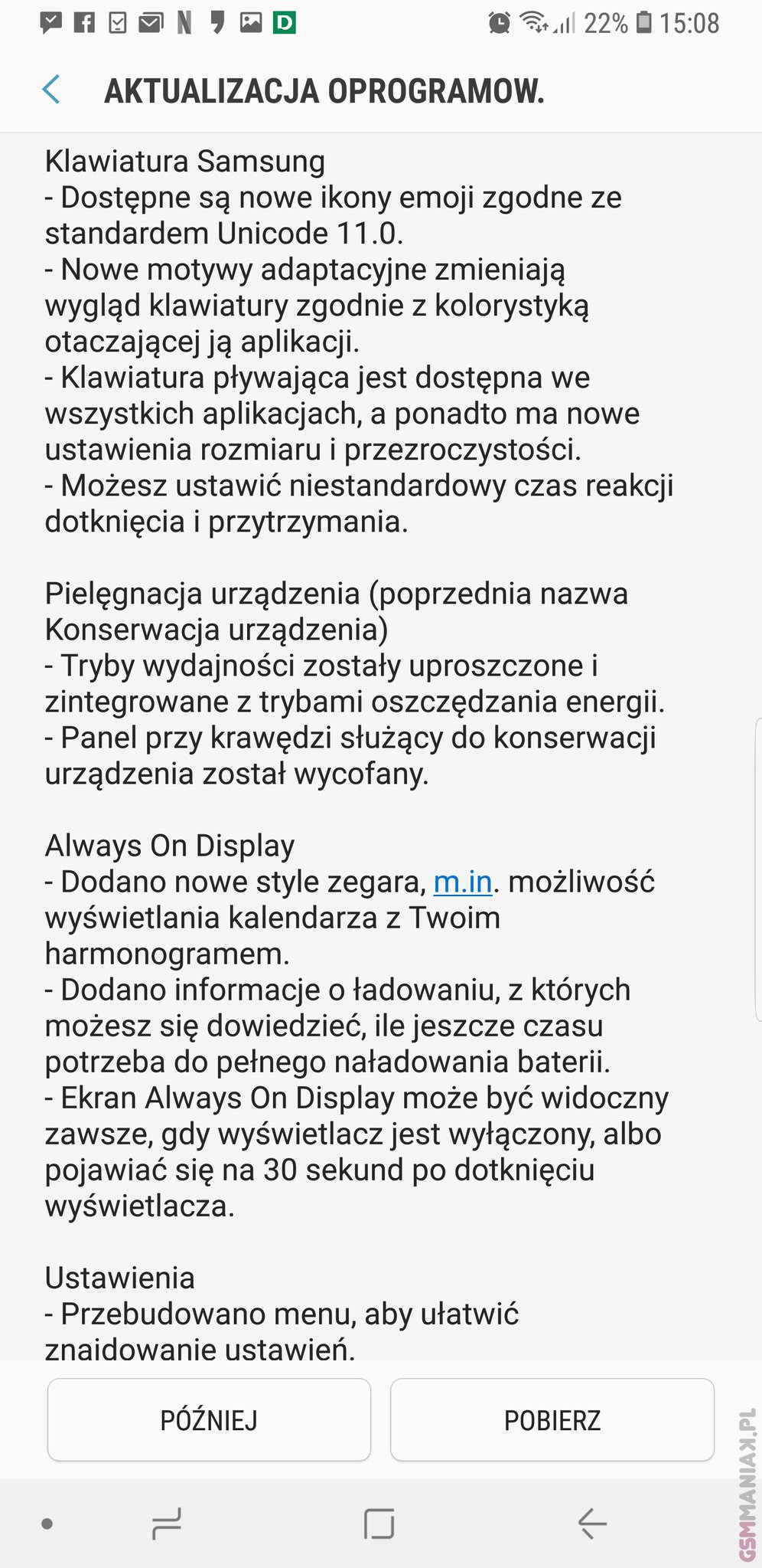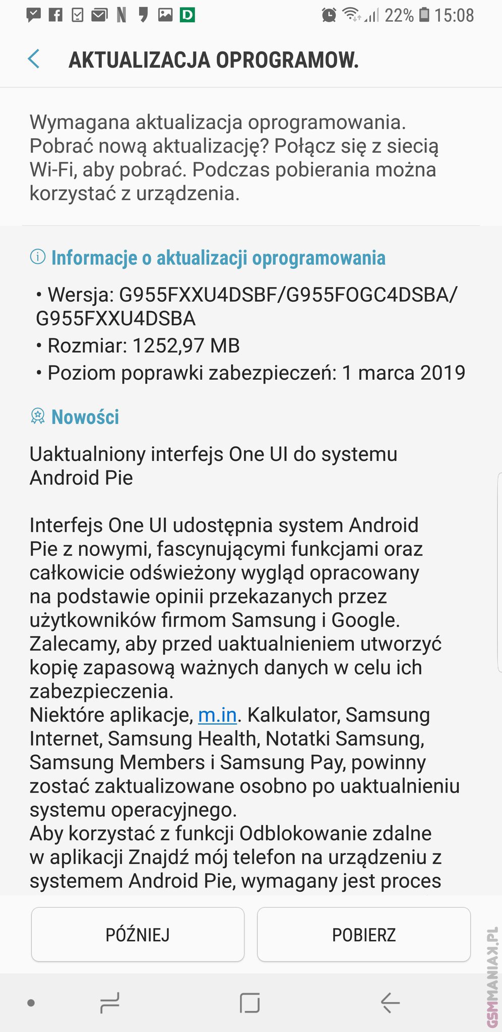 Niektóre aplikacje, m.in. Kalkulator, Samsung Internet, Samsung Health, Notatki Samsung, Samsung Members i Samsung Pay, powinny zostać zaktualizowane osobno po uaktualnieniu systemu operacyjnego