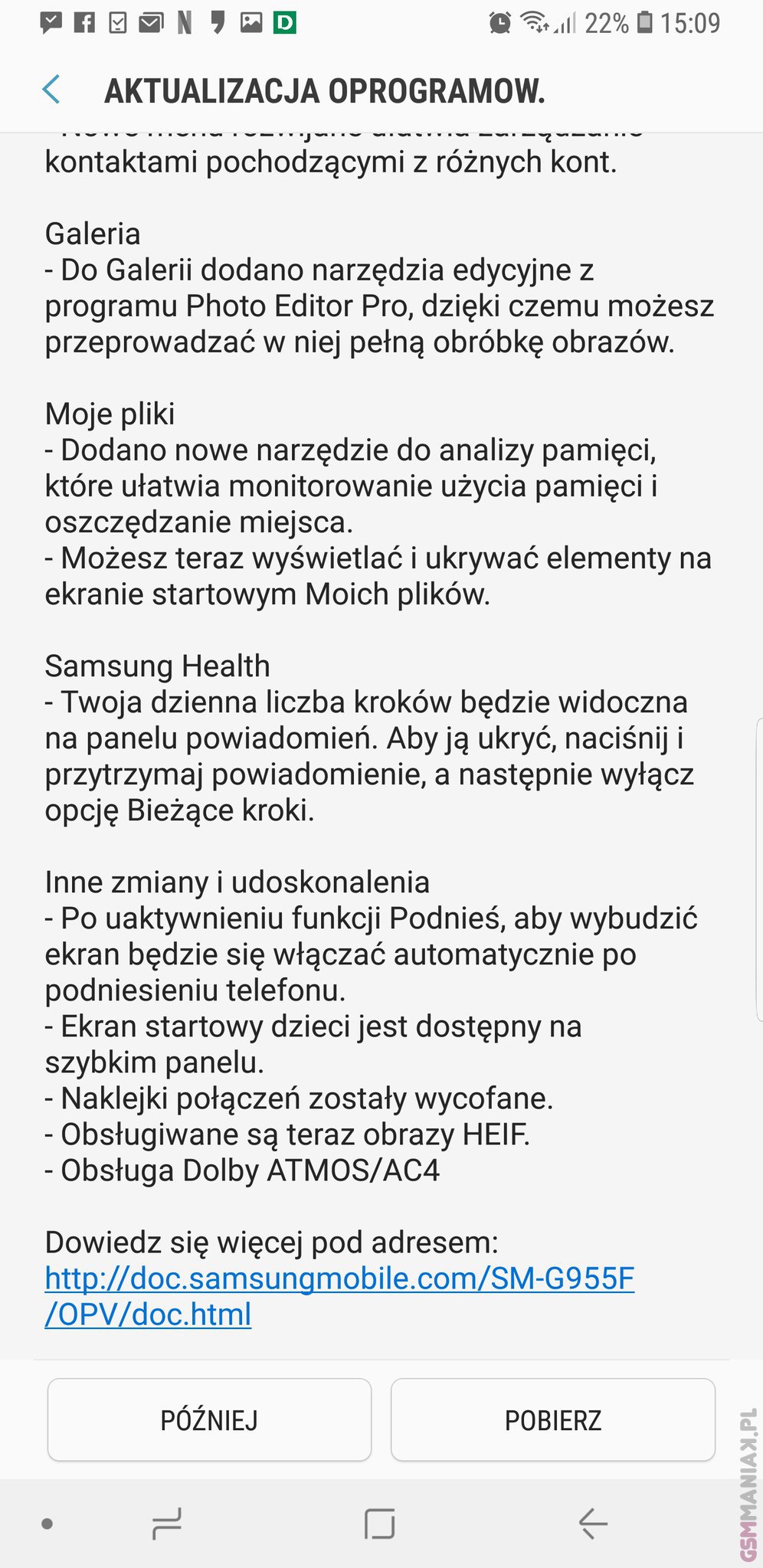 Na całe szczęście posiadacze Samsunga Galaxy S8+ pochodzącego z Orange Polska od dzisiaj (01/04/2018) mogą pobrać wspomnianą aktualizację. Oczywiście została udostępniona za pośrednictwem bezprzewodowego kanału OTA i waży nieco ponad 1.2GB (1252,97 MB). Warto zatem przed rozpoczęciem procesu pobierania, aktywować połączenie z siecią WiFi w celu szybszego pobierania, a także zminimalizowania kosztów wynikających z pakietowej transmisji danych.