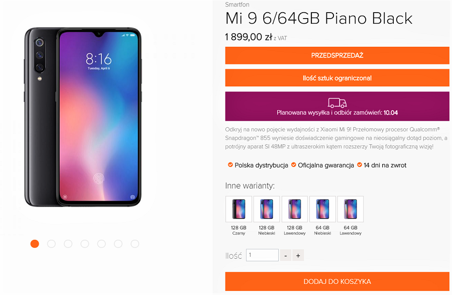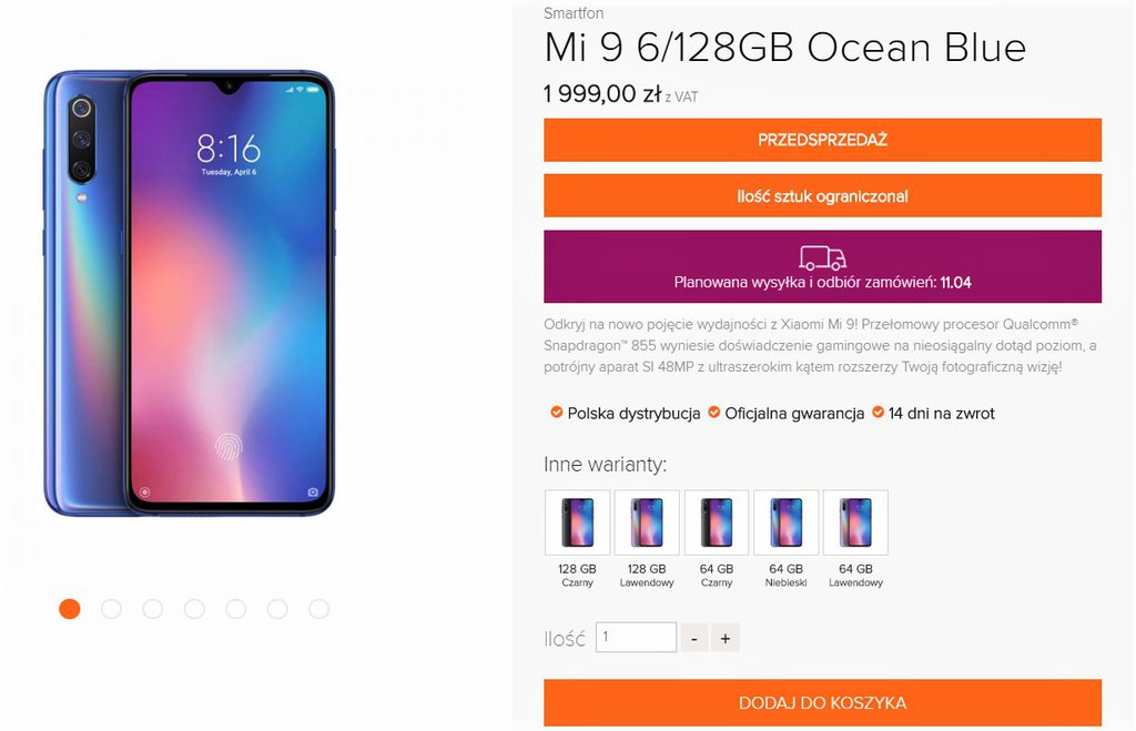Xiaomi Mi 9 po raz kolejny dostępny jest na zamówienie w oficjalnym sklepie internetowym Xiaomi w Polsce. Niestety, jak na razie tylko w wariancie 6/64 GB i kolorze Piano Black oraz wersji 6/128 GB i kolorze Ocean Blue. Niestety, jak na razie nie wiadomo, kiedy dostępne będą inne wersje pamięci i kolory.